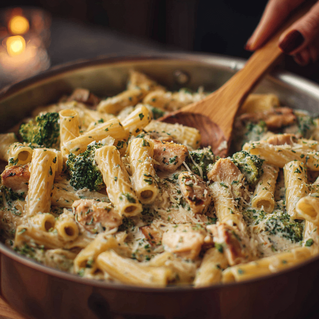 Mix pasta, chicken, broccoli, and sauce in a large bowl.