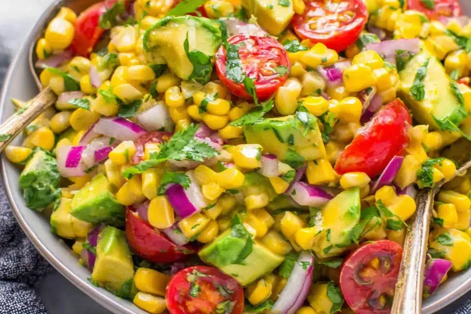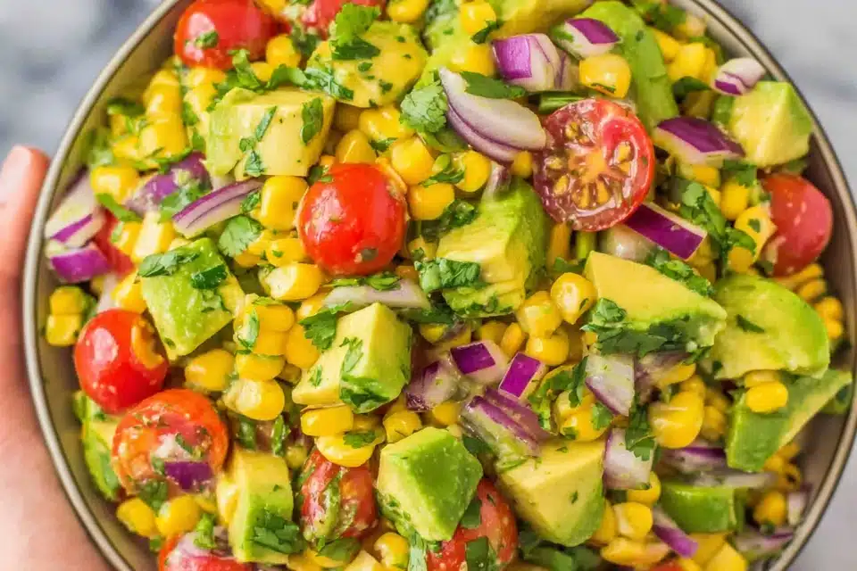 Corn Salad Recipe with Avocado offers a satisfying mix of vegetables, healthy fats, fiber, and fresh herbs. Corn provides natural sweetness and carbohydrates for energy, while avocado adds creamy texture and unsaturated fats. Tomatoes, onion, jalapeño, cilantro, and lime bring freshness and flavor without making the salad heavy.