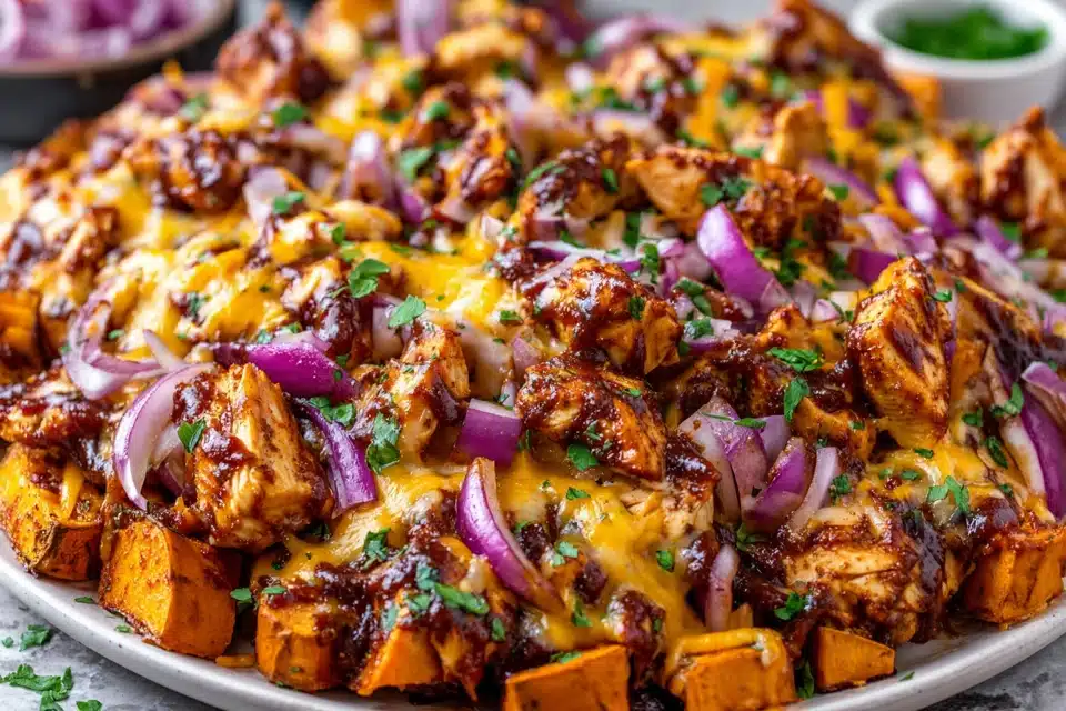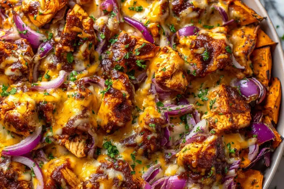 A hearty one-pan skillet with sweet potatoes, smoky BBQ chicken, and melted cheese that brings bold, comforting flavor in every bite.