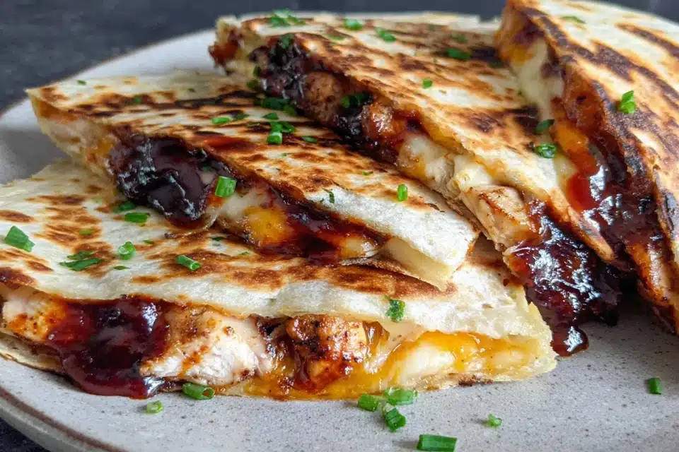 Griddle-cooked quesadillas filled with BBQ chicken, hot honey glaze, melted cheese, and vegetables for a smoky sweet meal.