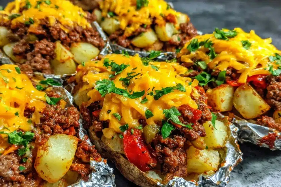 The packets are ready when the potatoes are soft and the ground beef is fully cooked with no pink remaining. Carefully open one packet to check texture and doneness. Cooking time may vary depending on heat source, so checking one packet first helps avoid overcooking or undercooking the rest.