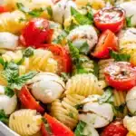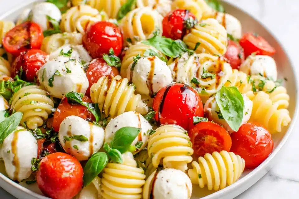 Easy Caprese Pasta Salad is a fresh and simple dish made with tender pasta, juicy tomatoes, creamy mozzarella, and basil, all tossed in a light olive oil and balsamic dressing. Perfect for summer meals, picnics, and quick lunches.
