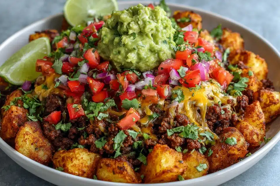 A fully loaded taco bowl featuring crispy roasted potatoes, seasoned taco meat, and your favorite toppings — a fun, hearty twist on taco night.