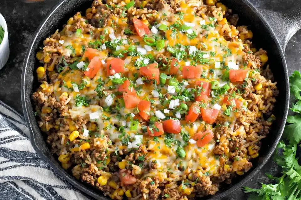 Cheesy Taco Rice Skillet brings seasoned ground beef, tender rice, melted cheese, and classic taco flavors together in one pan. The dish cooks in a single skillet, making it practical for busy evenings while still delivering a rich, satisfying bowl-style meal.
