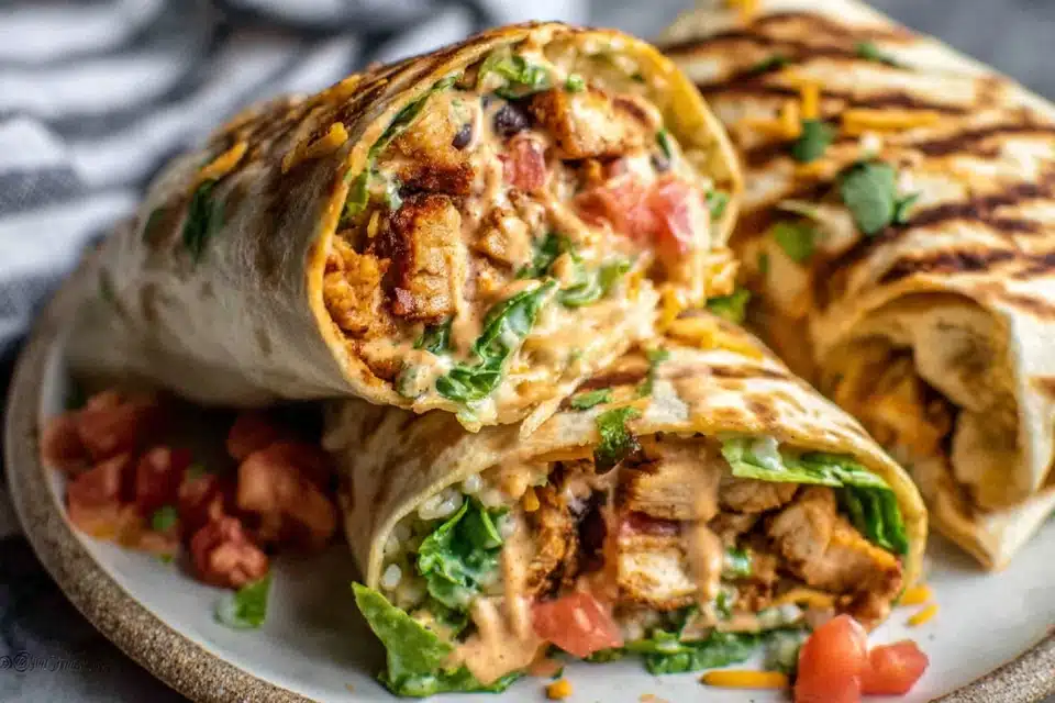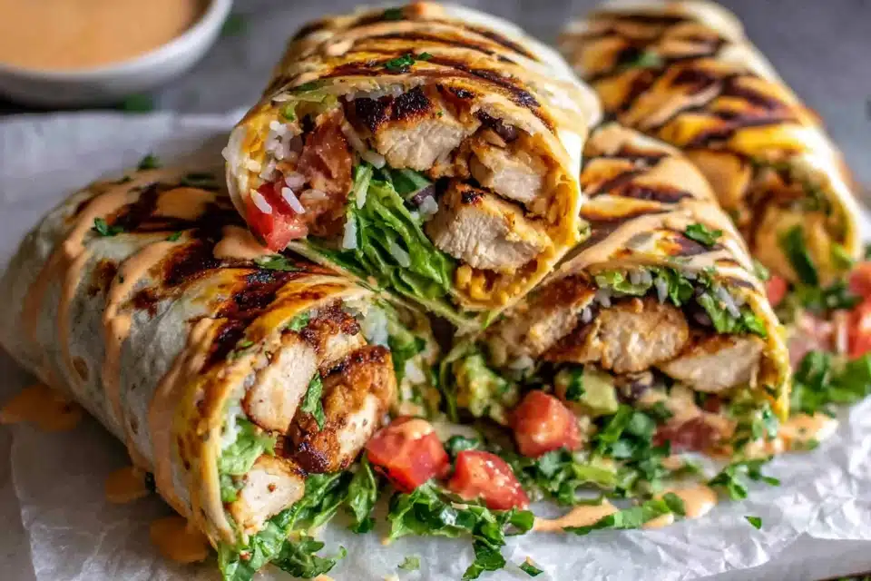 Grilled chicken burritos filled with rice, beans, fresh vegetables, and creamy chipotle ranch sauce wrapped in a warm tortilla.