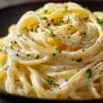 Silky spaghetti coated in a rich garlic parmesan cream sauce. Comforting, simple, and ready in under 30 minutes.