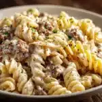 The sauce starts with seasoned beef, garlic, and onion, simmered with broth and cream, then folded together with perfectly cooked pasta and melty cheese. It’s quick to prepare, easy to love, and even better the next day. Whether you’re feeding a family or just yourself, this creamy pasta delivers restaurant-level flavor with pantry-staple ingredients.