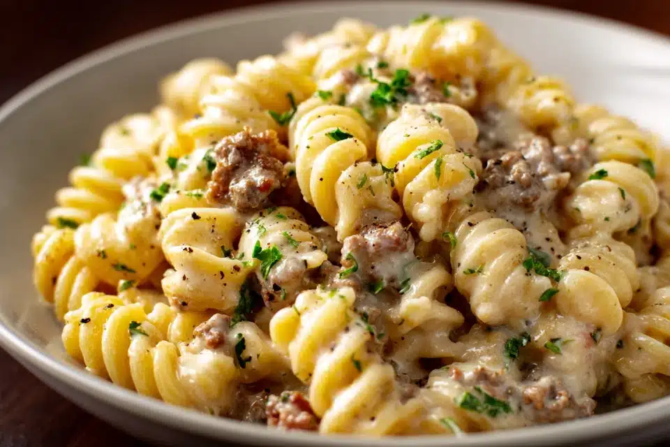 A cozy one-pot creamy beef pasta made with ground beef, garlic, herbs, and a rich cheese-laced sauce. Hearty, simple, and perfect for cold nights.