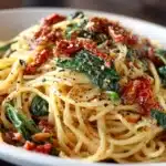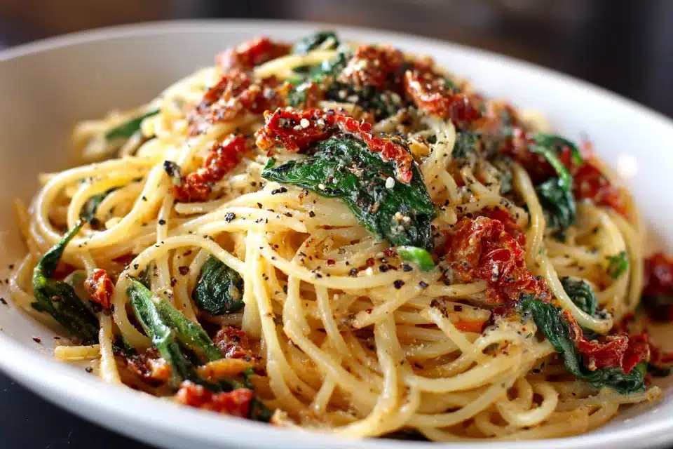A creamy, garlicky pasta dish with sun-dried tomatoes and fresh spinach, tossed with spaghetti and Parmesan — comforting, flavorful, and ready in 30 minutes.