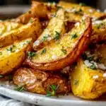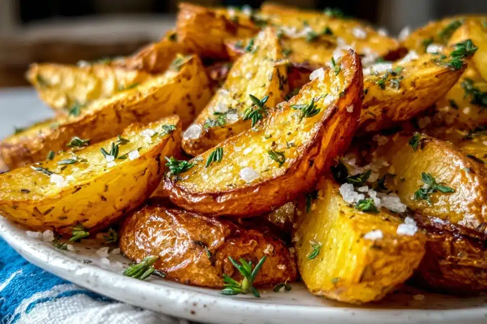 This dish stands out because the potatoes are not simply roasted dry. Instead, they are baked in seasoned liquid first, allowing them to soften and soak up citrus and herbs. As the liquid reduces, the edges crisp up beautifully, creating that signature texture contrast.