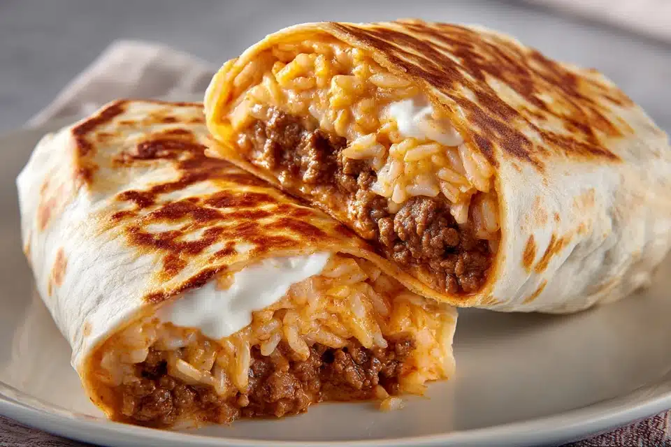 Grilled Cheese Burrito Made Easy brings together seasoned beef, warm rice, creamy sauce, and melted cheese wrapped inside a soft tortilla, then finished with a crisp layer of grilled cheese on the outside. It delivers the comfort of a burrito with the indulgent texture of a grilled cheese sandwich.