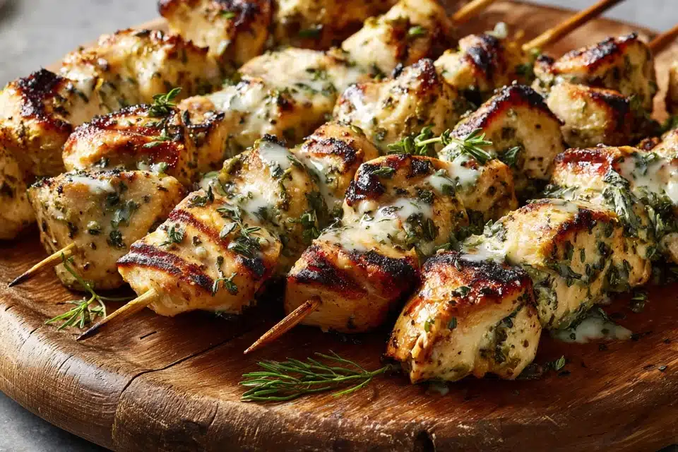 Juicy grilled chicken skewers coated in ranch seasoning, garlic, and parmesan with a buttery finish.