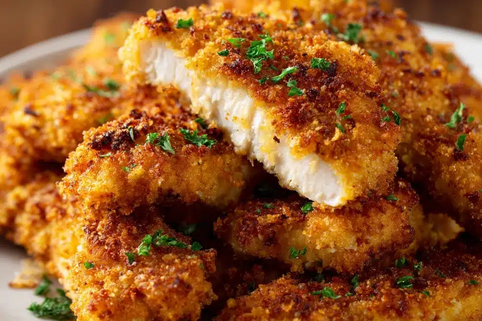 Golden, crispy, oven-baked chicken tenders coated in seasoned panko — juicy inside, crunchy outside, and perfect for dipping.