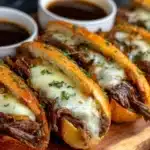 This recipe fits well for busy days when hands-off cooking is preferred. The slow cooker does most of the work, turning a simple cut of beef into a juicy filling that pairs perfectly with a warm dipping broth. Each sandwich delivers soft, shredded beef layered inside a toasted roll, served alongside a flavorful au jus for dipping.