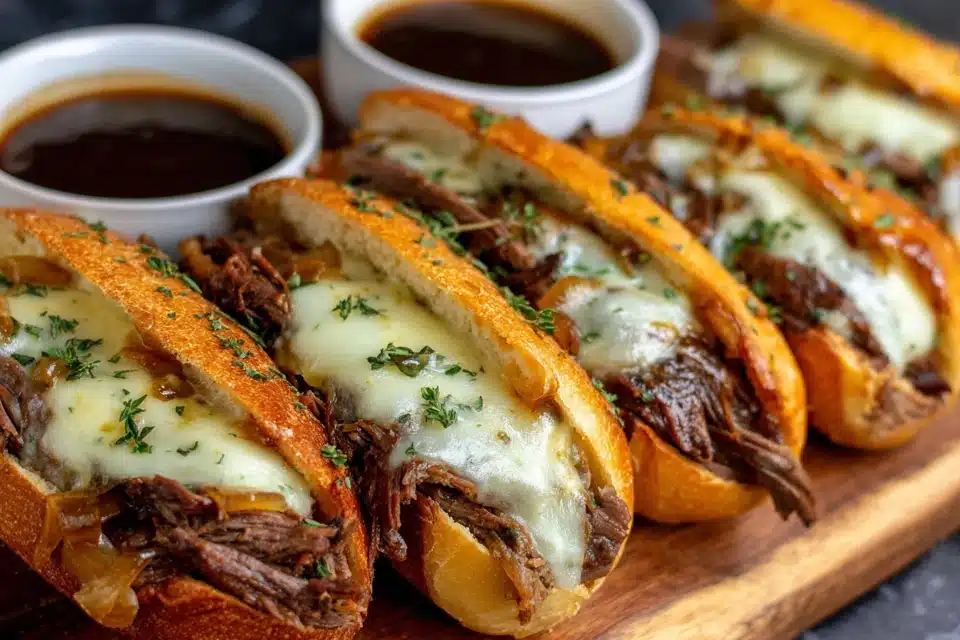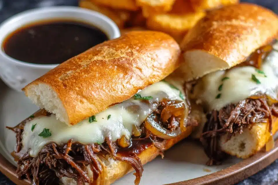 Tender slow-cooked beef piled on toasted rolls and served with rich au jus for dipping, creating a hearty sandwich meal.
