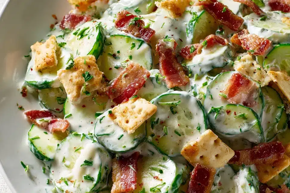 Crisp cucumbers, smoky bacon, shredded cheese, and buttery crackers tossed in creamy ranch dressing for a refreshing summer side dish.