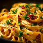Perfect for both vegans and omnivores, this pasta is rich without being heavy and comes together in under 30 minutes. The savory depth of sun-dried tomatoes balances beautifully with creamy elements and fresh basil, delivering bold Mediterranean flavor in every bite.