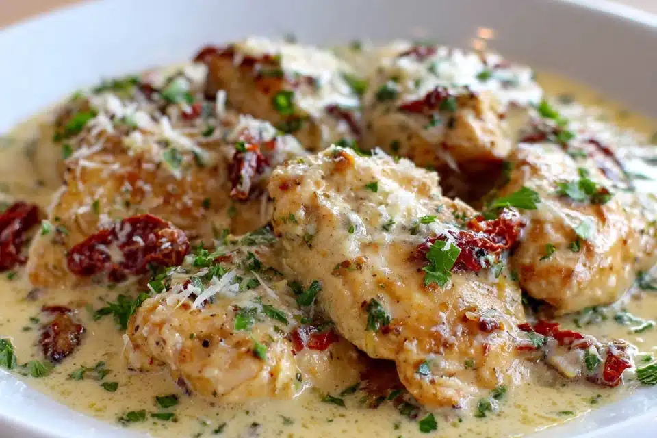 The finished dish offers a creamy garlic sauce filled with tender chicken and small bursts of tangy sun-dried tomato flavor. Paired with pasta, rice, or crusty bread, it becomes a satisfying meal that feels both comforting and elegant.