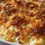 This dish is known for its hearty texture and bold taste. It brings together simple ingredients that bake into a cohesive casserole with a golden top and a soft, flavorful interior. The French onion element adds depth through onion seasoning and savory notes that complement the creamy base.