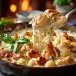 The dish borrows its sauce from classic fettuccine Alfredo—made from butter, garlic, heavy cream, and Parmesan—then elevates it with seared chicken and soft gnocchi cooked right in the sauce. It’s indulgent, comforting, and totally crave-worthy.