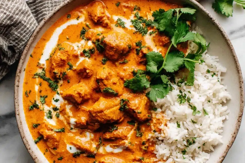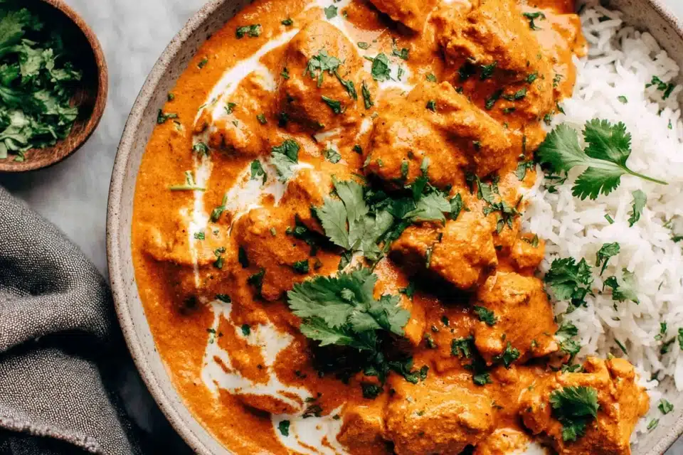 Basmati rice is a common pairing because it absorbs the sauce well. Naan bread or flatbread also works for scooping the creamy chicken. Simple vegetable sides like roasted carrots or cucumber salad help balance the richness of the dish.