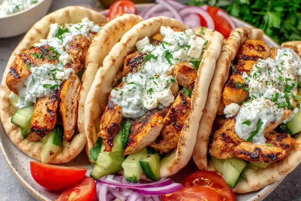 The chicken is marinated in olive oil, lemon, garlic, and herbs, then cooked until golden and tender. It is layered inside soft pita bread with crisp vegetables and a creamy tzatziki sauce that includes feta cheese for extra richness and tang.