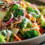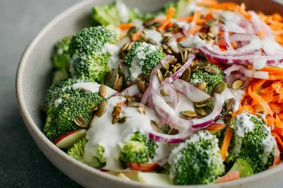 This salad can be prepared several hours before serving and stored in the refrigerator. Many people find that the flavor improves after resting because the broccoli absorbs some of the dressing. If preparing the salad a full day ahead, consider storing the dressing separately and mixing it with the vegetables shortly before serving. This approach keeps the ingredients crisp and fresh.