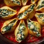 Stuffed shells are a beloved Italian-American staple—pillowy pasta stuffed with creamy cheese and baked in tomato sauce. This version skips the meat and instead loads the filling with iron-rich spinach, creamy ricotta, and just enough mozzarella to keep things melty and satisfying.