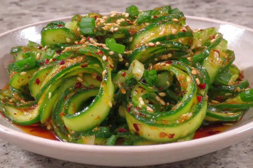 Spicy spiral cucumber salad with crisp cucumbers, chili oil, garlic, and sesame dressing. A light, crunchy side dish with bold heat and tang.