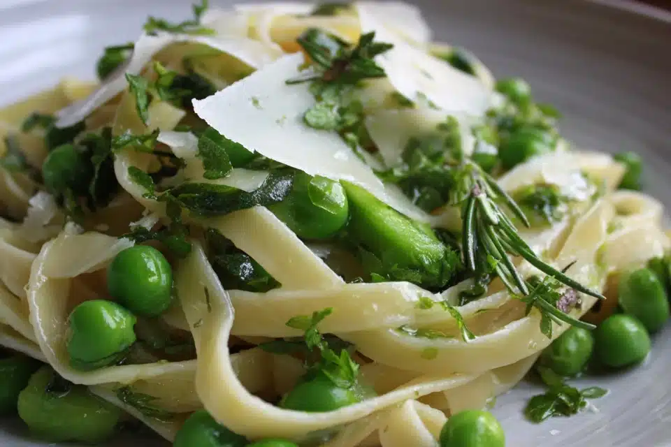 Light fettuccine tossed with sweet peas, fresh garden herbs, garlic, lemon, and Parmesan, optionally garnished with toasted nuts for a vibrant spring pasta dish.