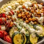 This Roasted Chickpea and Veggie Bowl is a fast, wholesome vegetarian meal that’s as satisfying as it is vibrant. It brings together crispy oven-roasted chickpeas, tender caramelized vegetables, and a hearty grain base, all tied together with a zesty tahini or yogurt-based sauce.