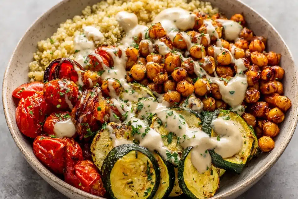 This Easy Roasted Chickpea and Veggie Bowl is a quick, satisfying vegetarian meal packed with crispy chickpeas, tender vegetables, hearty grains, and a creamy tahini or yogurt dressing—all ready in 30 minutes.