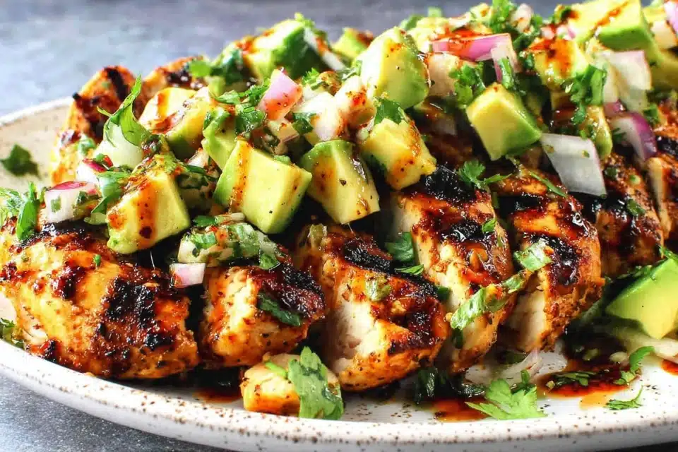 A fresh and flavorful chicken dish marinated in lime and spices, served with creamy avocado and vibrant toppings.