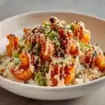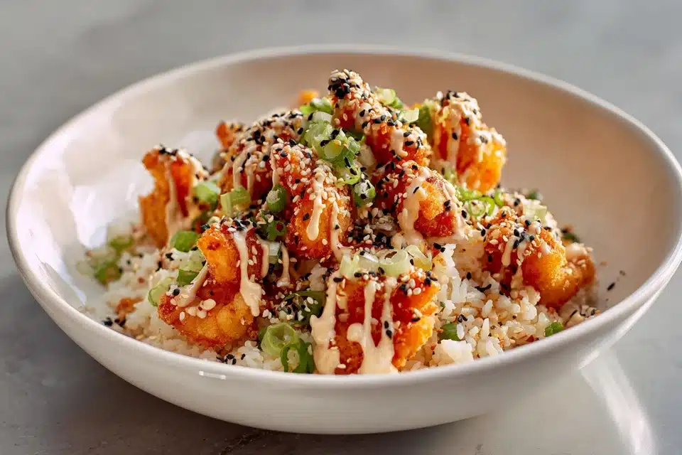 It’s the perfect mix of textures and flavors: the rich creaminess of Bang Bang sauce, the slight char of stir-fried rice, and the pop of scallions and crispy toppings. Whether you’re making it with shrimp, chicken, or tofu, this dish brings restaurant-style flavor to your own kitchen — with no deep frying required.