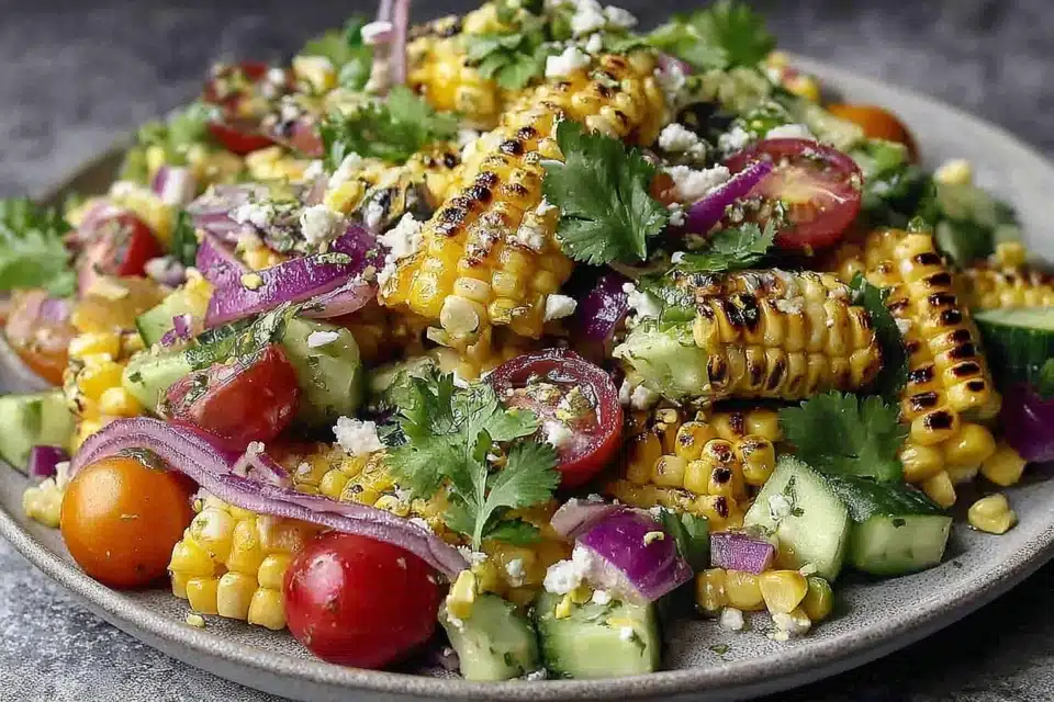 This recipe is all about contrast. The warm, slightly charred corn pairs beautifully with crunchy vegetables and a bright, tangy dressing that ties everything together. Every bite delivers sweetness, acidity, freshness, and a hint of smokiness that keeps the salad light yet deeply flavorful.