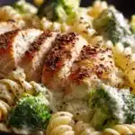 This High Protein Rotisserie Chicken Broccoli Pasta is a go-to dinner when you need something satisfying, quick, and nourishing. Juicy rotisserie chicken meets tender broccoli florets and al dente pasta, all coated in a creamy garlic-Parmesan sauce that clings to every bite.