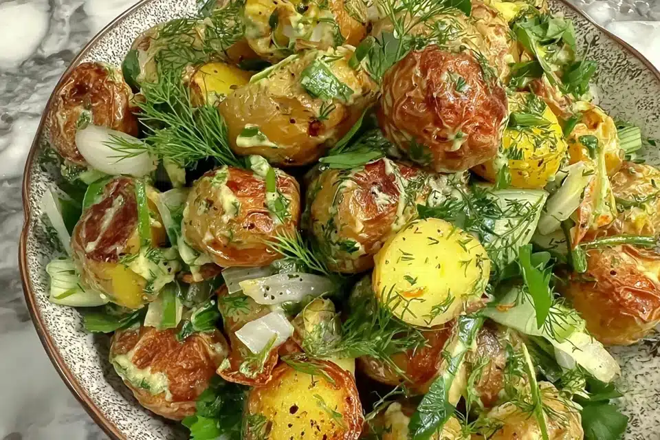 Herbed Roasted Potato Salad Recipe is a warm and flavorful twist on classic potato salad, featuring oven-roasted potatoes tossed with fresh herbs, a light tangy dressing, and simple pantry ingredients. Unlike traditional creamy versions, this recipe highlights crisp-edged roasted potatoes that absorb seasoning beautifully while staying soft inside.