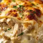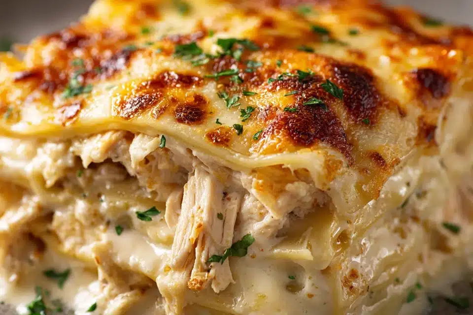 Chicken Alfredo Lasagna is the ultimate cozy dinner—layers of tender shredded chicken, creamy Alfredo sauce, and perfectly cooked lasagna noodles baked together into a golden, bubbly masterpiece. This version is surprisingly light, packing in all the rich, cheesy flavor with fewer calories and a serious protein punch.