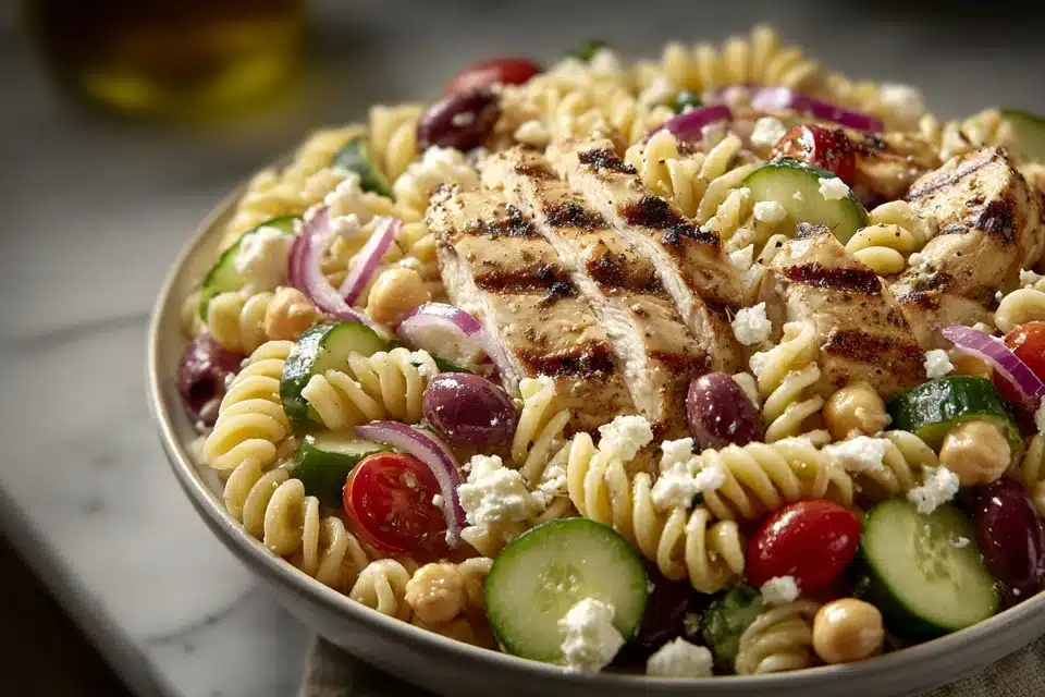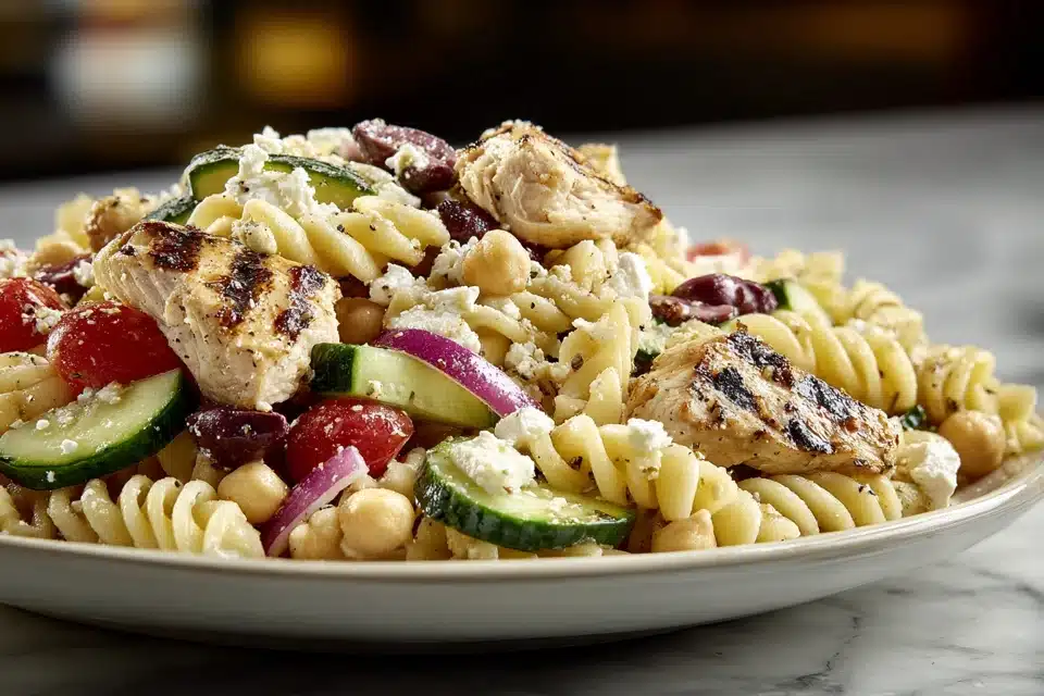 A High Protein Greek Pasta Salad made with tender pasta, chicken or chickpeas, fresh vegetables, feta cheese, and a light lemon-olive oil dressing.