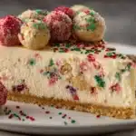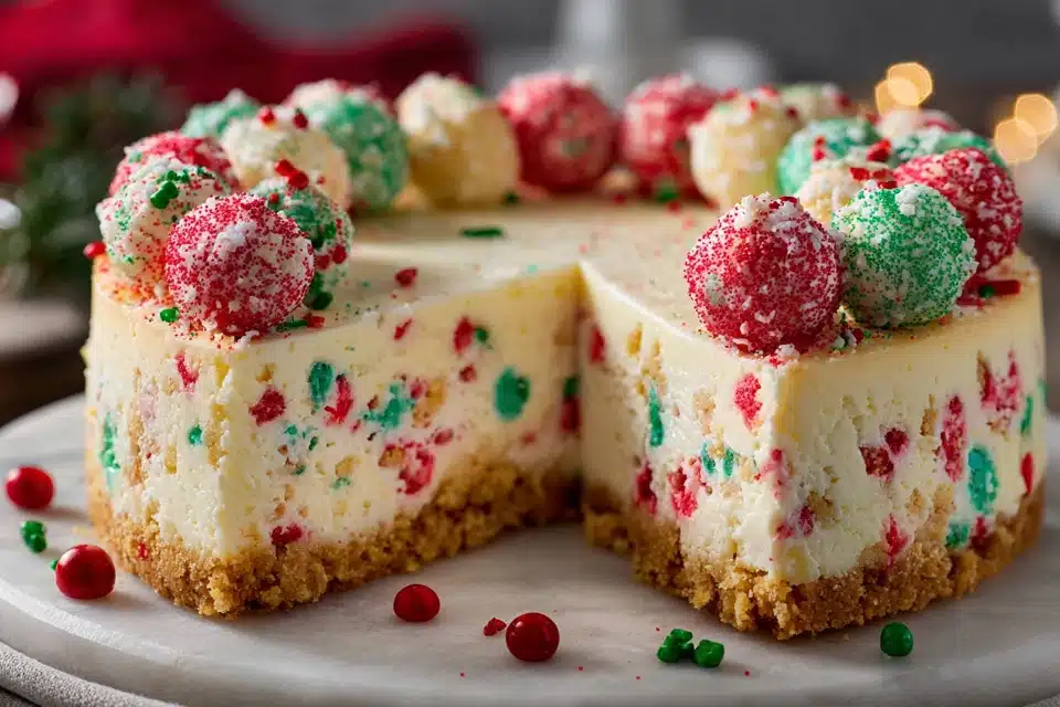 A rich and creamy sugar cookie cheesecake with a buttery cookie crust and festive topping. A perfect blend of holiday cheer and classic dessert indulgence.