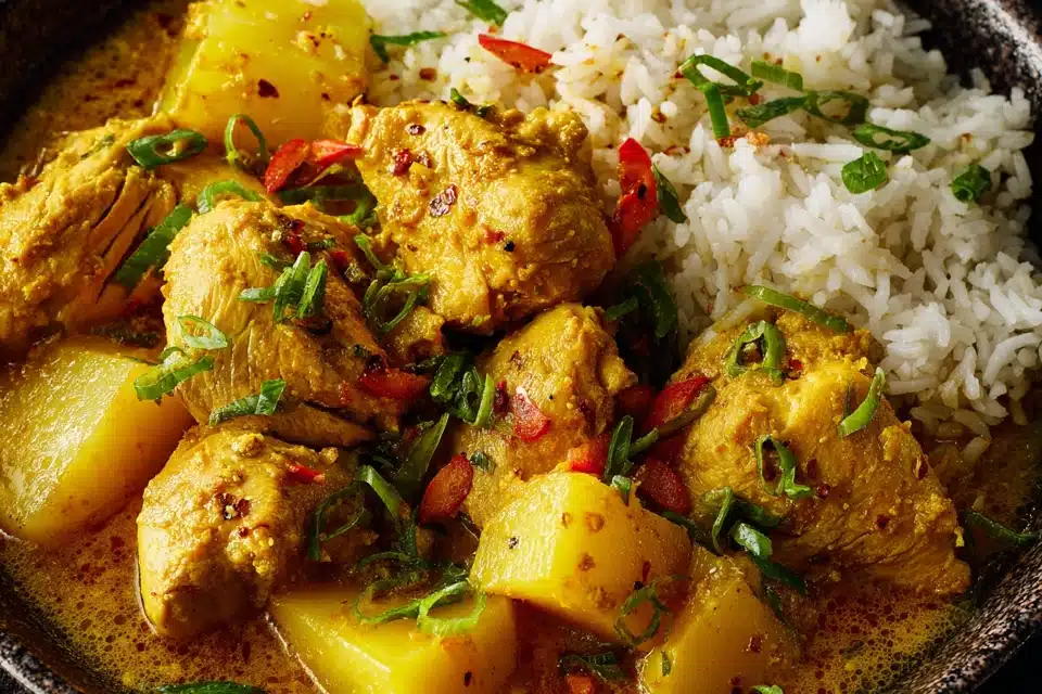 Authentic Jamaican Curry Chicken is a rich, warming dish infused with deep island flavor, golden spices, and a touch of heat. Bone-in chicken is marinated in a vibrant curry blend, then simmered slowly with onions, garlic, thyme, and potatoes in a silky, aromatic sauce that clings to every bite.