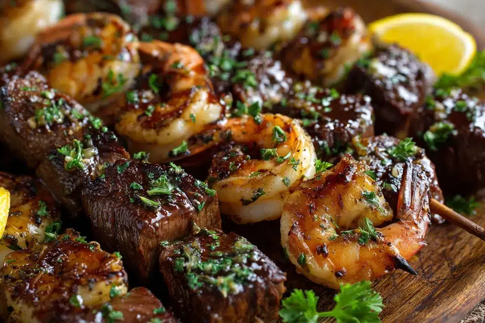 Juicy grilled steak and shrimp skewers finished with rich garlic butter sauce.