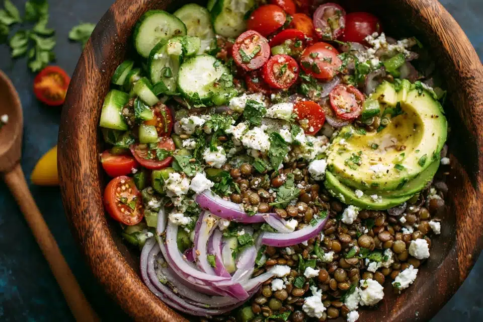 It’s the kind of salad you can make ahead, pack for lunch, or serve as a light dinner. Each bite delivers a mix of creamy lentils, crunchy vegetables, and citrusy zing—balanced, colorful, and loaded with natural goodness.
