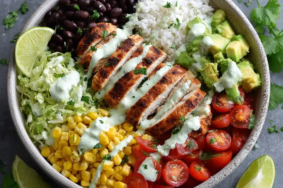 A fast, flavorful, and low-calorie chicken burrito bowl packed with lean protein, veggies, and fresh toppings. Ready in 30 minutes and perfect for meal prep or weeknight dinners.