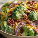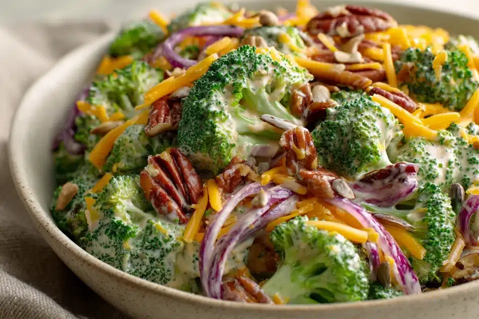 With Skinny Broccoli Salad, the star ingredient is fresh broccoli, which provides a tender-crisp base full of vitamins, fiber, and natural color. Complementary ingredients such as red onion, shredded carrots, and dried cranberries create a visual and flavor contrast, while a lighter yogurt-based or vinaigrette-style dressing ensures each bite is flavorful but not overly rich. Nuts or seeds add texture and a subtle nutty flavor, rounding out this wholesome salad.