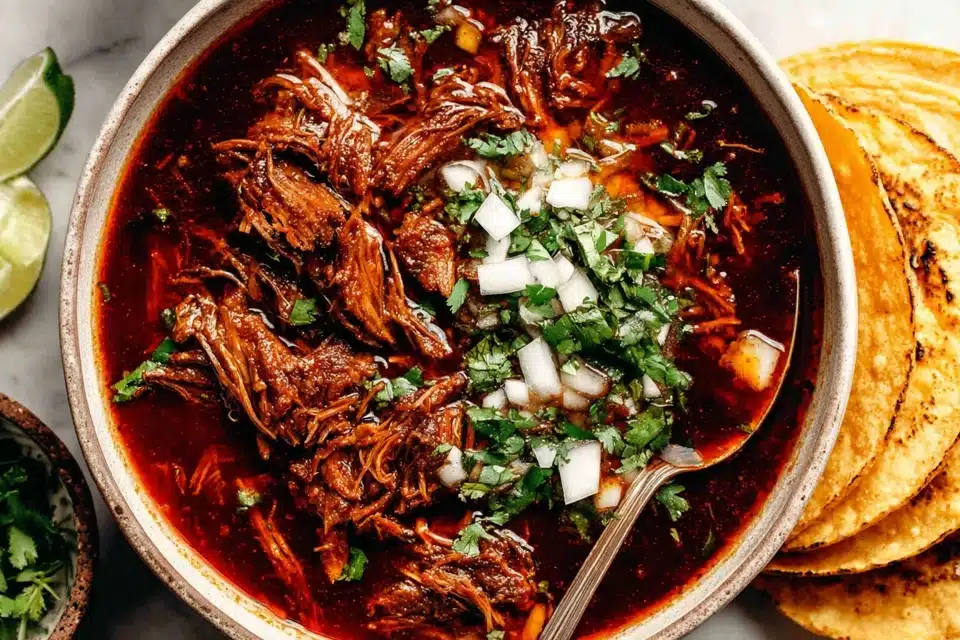Mexican birria crockpot recipe with tender beef slow-cooked in rich chili broth, served with warm tortillas, onion, cilantro, and lime for bold comfort flavor.