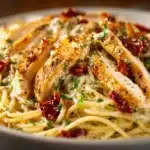Loaded with shredded chicken, sautéed peppers, and two kinds of cheese, this casserole-style spaghetti is creamy, cheesy, and satisfying without being heavy. It’s the kind of dish that feels indulgent, but still uses real ingredients and simple prep — ideal for busy weeknights, potlucks, or casual dinners at home.