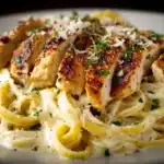 A rich and creamy chicken Alfredo pasta made with sautéed chicken breast, Parmesan cheese, and a smooth garlic Alfredo sauce tossed with your favorite pasta.