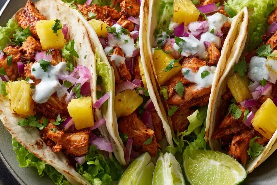 Served in warm tortillas and topped with fresh vegetables, these tacos offer a combination of juicy chicken, sweet pineapple, and crisp toppings. The result is a meal that feels colorful, balanced, and full of bright flavor.