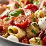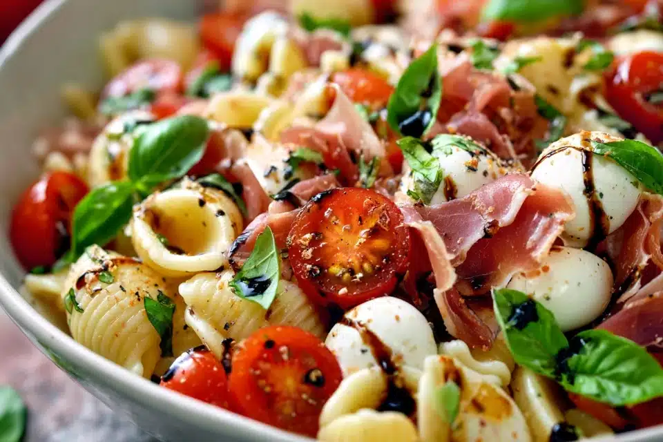 Prosciutto Caprese Pasta Salad brings together the timeless flavors of a classic Caprese salad with the rich, savory depth of delicate prosciutto. Tender pasta is tossed with juicy tomatoes, creamy mozzarella, fragrant basil, and ribbons of thinly sliced prosciutto for a dish that feels both light and satisfying.